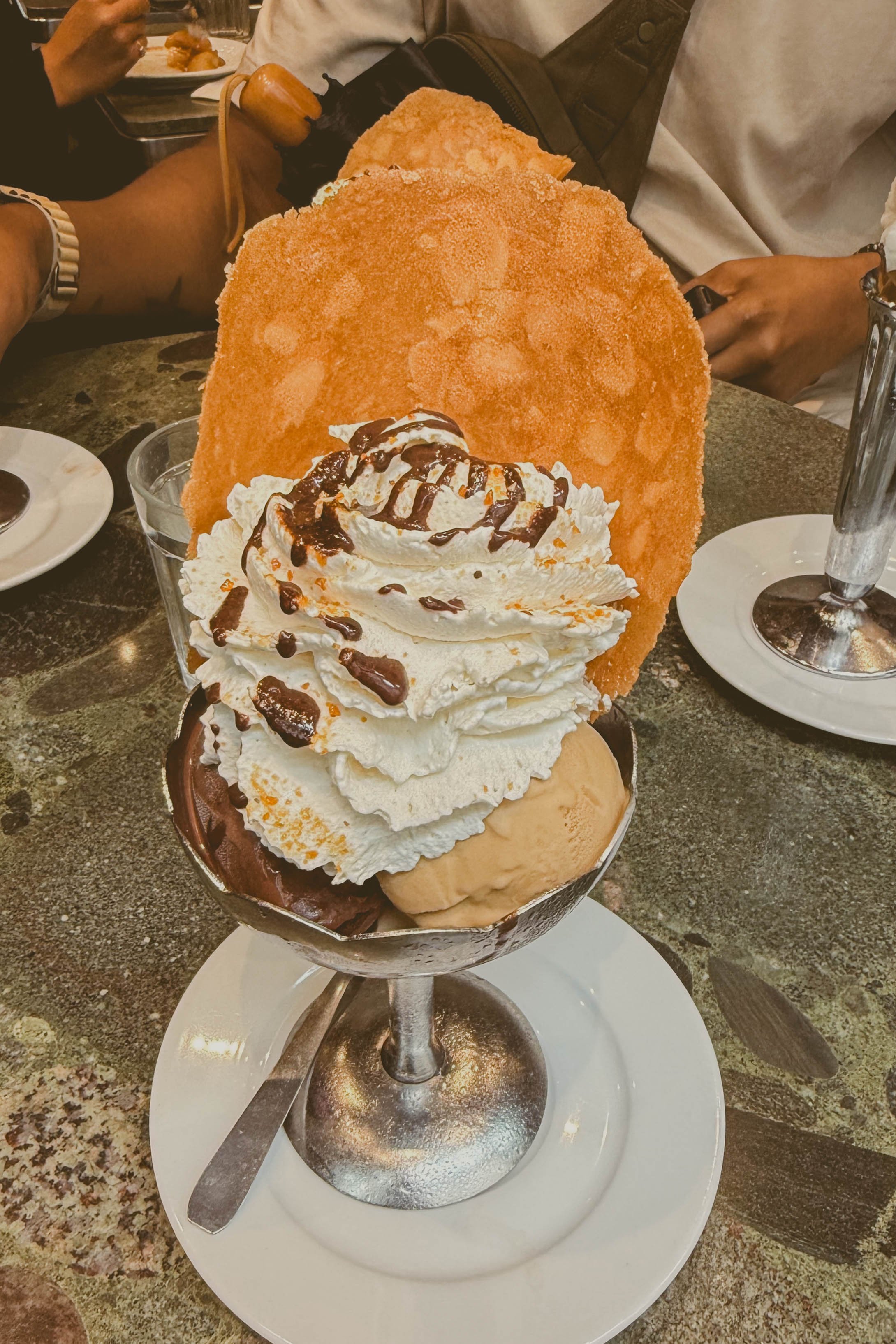 Well, we all know Paris is elite in the dessert department, and it can be overwhelming knowing where to go (the answer is pretty much anywhere, for dessert is good). We couldn’t resist heading to the oldest ice cream shop in Paris, and this place did not disappoint. It's located in Île Saint-Louis, very close to Le Marais (a cute area to walk around). There is a small indoor place to sit and enjoy ice cream, with a select set of flavors, and also really cute, delicious ice cream sundaes. Because their indoor seating is small and they don't take reservations, you are likely to have to wait a bit before being seated. A queue formed quickly behind us, and I recommend staying in the queue, as people will cut in front of you if you don't stand your ground. But if you don't feel like waiting, they have a strictly “to-go” area next door. There is nowhere to sit on that side, so you may have to sit on the sidewalk or walk and eat your ice cream. We opted to wait because it was rainy and not the best day to eat ice cream. The ice cream was decadent, fresh, and so delicious. They served it with fresh whipped cream, a biscuit, and chocolate sauce. Tens across the board. They also offer smaller portions for kids. You already know ice cream was a hit with them. The coffee and the caramel flavor were our favorites.